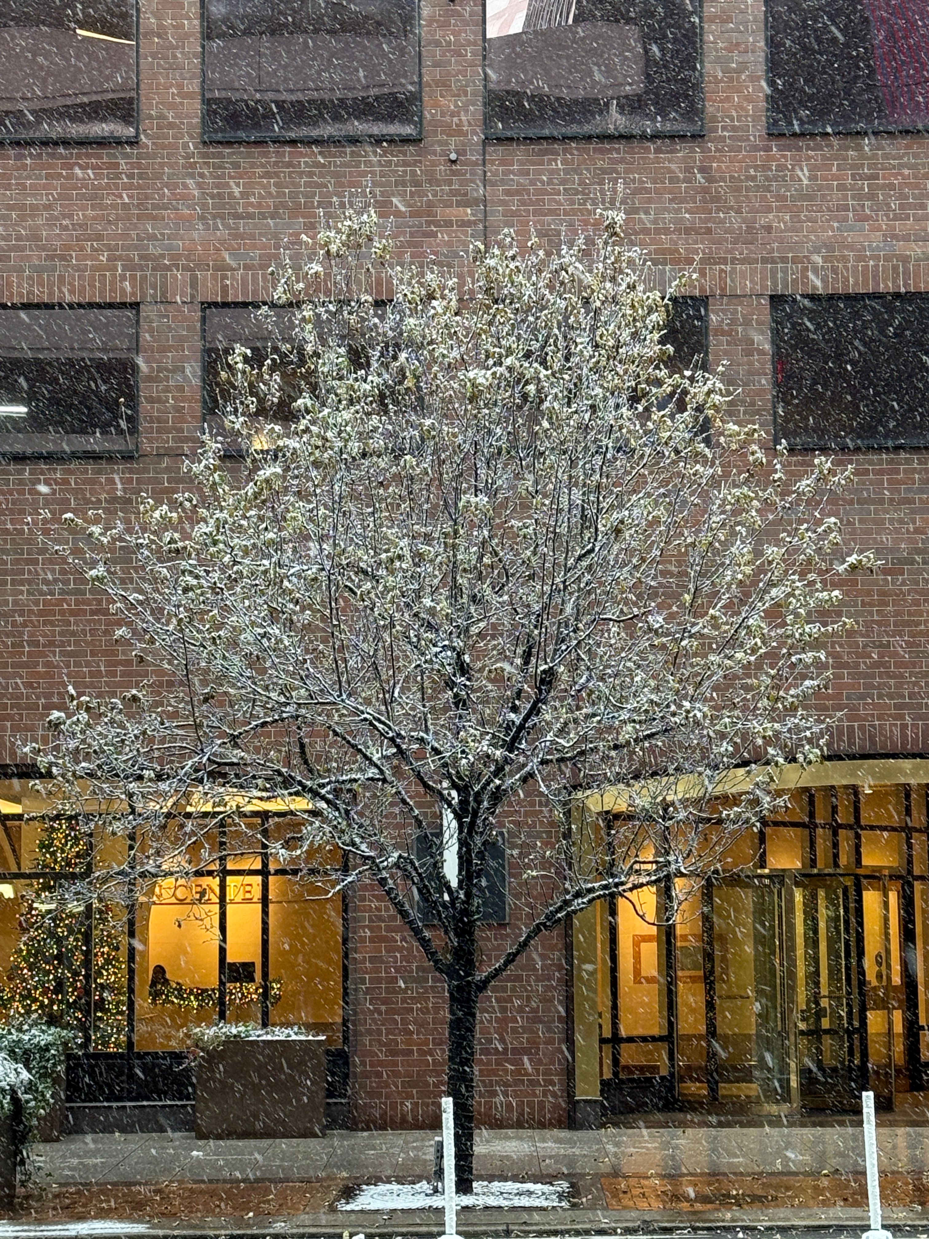 We got up to snow. I took a bit to walk around near the hotel and check out the snow and look at the city’s buildings in a new way. We walked around the city a bit trying to find a breakfast spot. After trying a couple places to no avail, we grabbed a quick breakfast at Green Eggs Cafe. The oatmeal was good and had good topping choices. It was cash only, which I like.